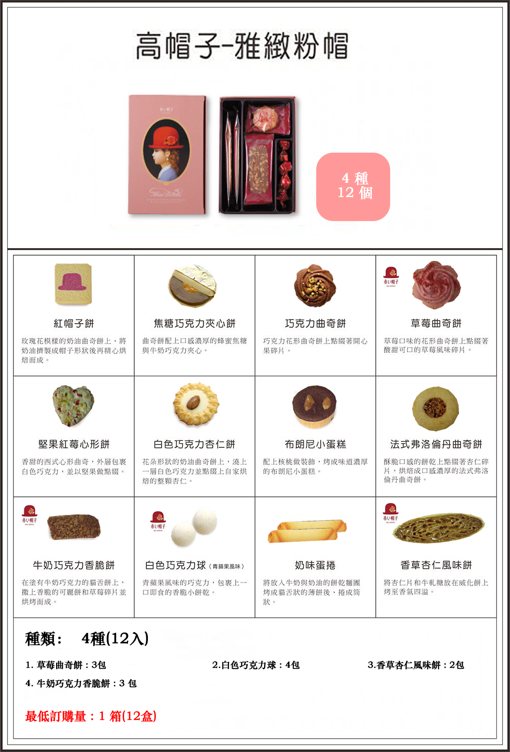 日本知名Akaibohshi 出品Tivolina 高帽子系列喜餅,典雅高貴超級美味的高帽子喜餅,是結婚或訂婚的喜餅禮盒第一選擇。佳評紅不讓的高帽子喜餅特推出六種不同之高帽子囍餅禮盒,如紅帽子訂婚喜餅、紅帽、粉帽喜餅、藍帽、紫帽、雅致粉彌月禮盒等。歡迎使用即時通、電話、傳真、與線上訂購高帽子、紅帽子囍餅。